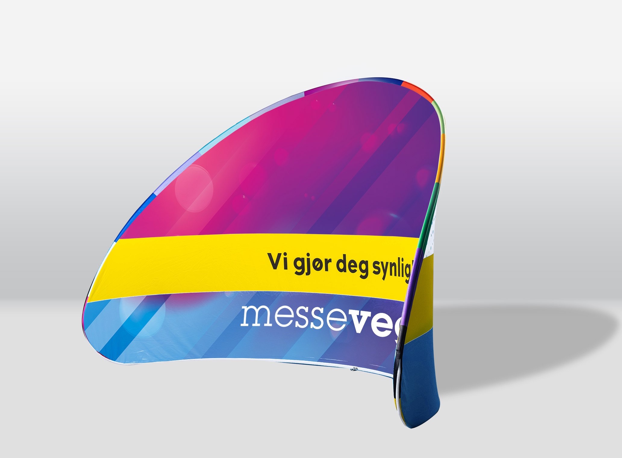 Messevegg Buet Halvsirkel gir et elegant preg til din messestand. Den dynamiske fasongen skaper en fin avgrensing mot omgivelsene, samtidig som følelse av luftighet iveretas. Buen i både grunnflaten og på trykkflaten sørger for en unik ramme som garantert vil trekke oppmerksomhet mot budskapet dit utover de mer «tradisjonelle» messeveggene.